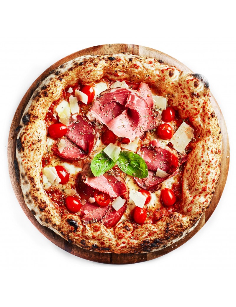 Sauce tomate, mozzarella, tranches de boeuf fumé, Grana Padano, tomates cerises, basilic